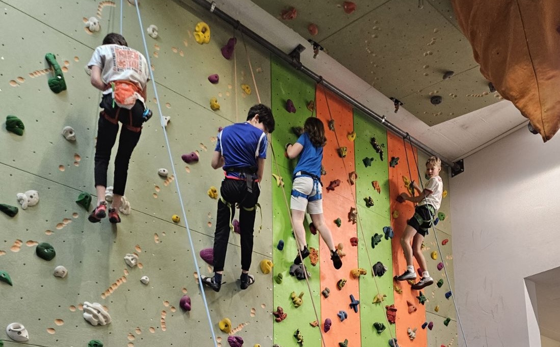 14 motivierte Jugendliche und Kinder waren dabei und kletterten Überhänge, hingen an der Decke der Halle, boulderten oder balancierten auf einer Slackline unter der Begleitung der Erwachsenen.