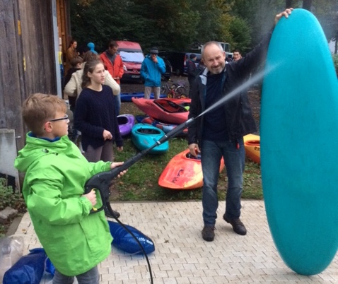 Die Boote die ins Schwimmbad kommen, müssen von Laub und Sand gesäubert und einmal ausgespritzt werden. Boote, Paddel, Spritzdecken und Auftriebskörper müssen außerdem überprüft und vorbereitet und der Bootsanhänger geladen werden.
