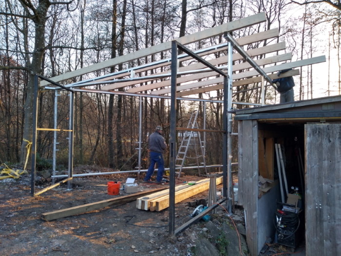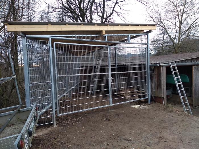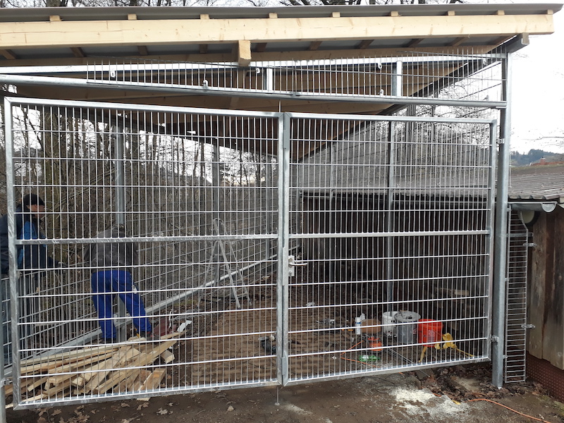 - Alexander Kagan und Mitarbeiter montierten die tragende, verzinkte Stahlkonstruktion, setzten das Dach auf und montierten die Tore und die Stabmatten.