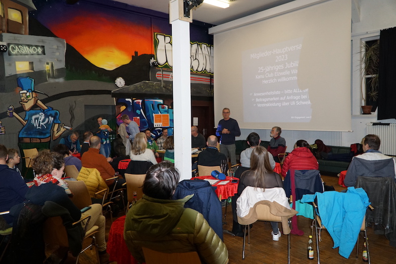 Nach einer pandemiebedingten virtuellen Hauptversammlung im letzten Jahr konnte der erste Vorsitzende Frank Schweikert am 21.01.23 im Jugendzentrum Kollnau 54 Vereinsmitglieder zur Jahreshauptversammlung begrüssen und verwies auf das dieses Jahr anstehende Jubiläum von 25 Jahren Kanu Club Elzwelle.